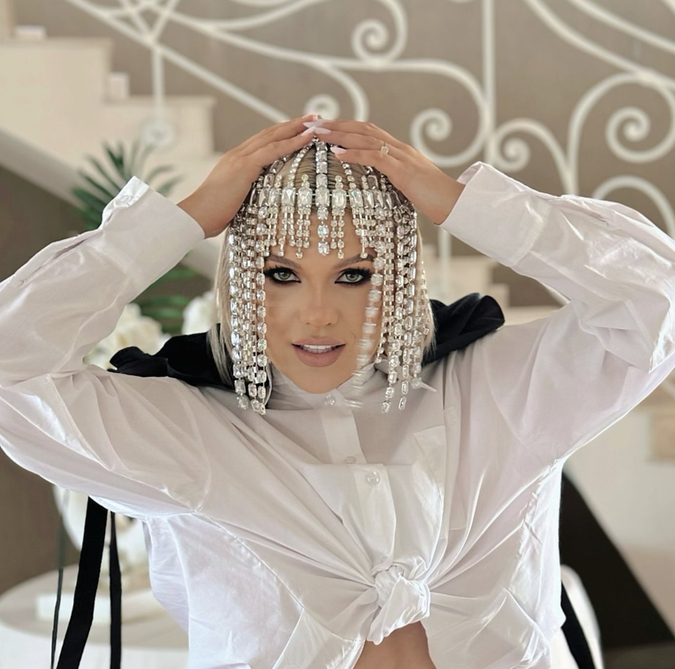 Istruzioni per l’uso: Per indossarlo, regolarlo per adattarlo comodamente alla testa. Modella delicatamente con le dita o con un pettine a denti fini. Evitare un’esposizione eccessiva al calore o a prodotti chimici aggressivi per preservare l’integrità della parrucca e dei cristalli.